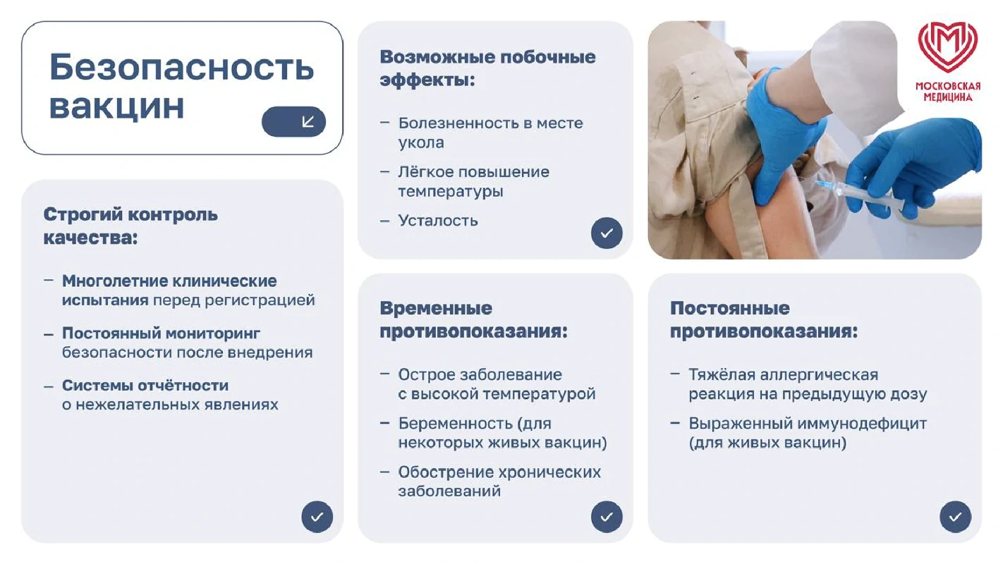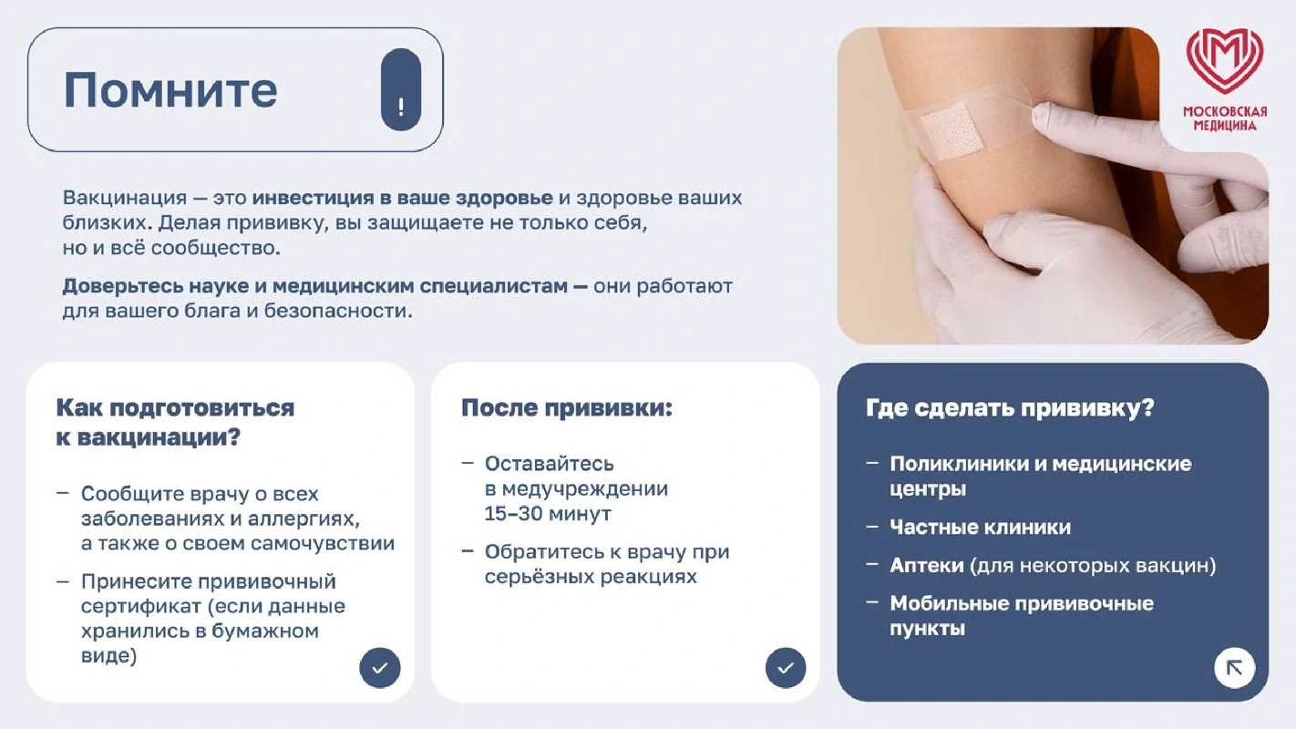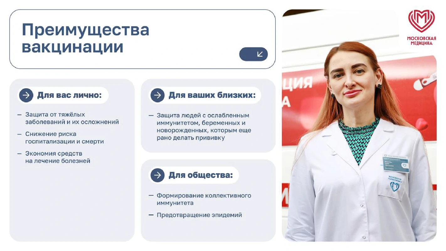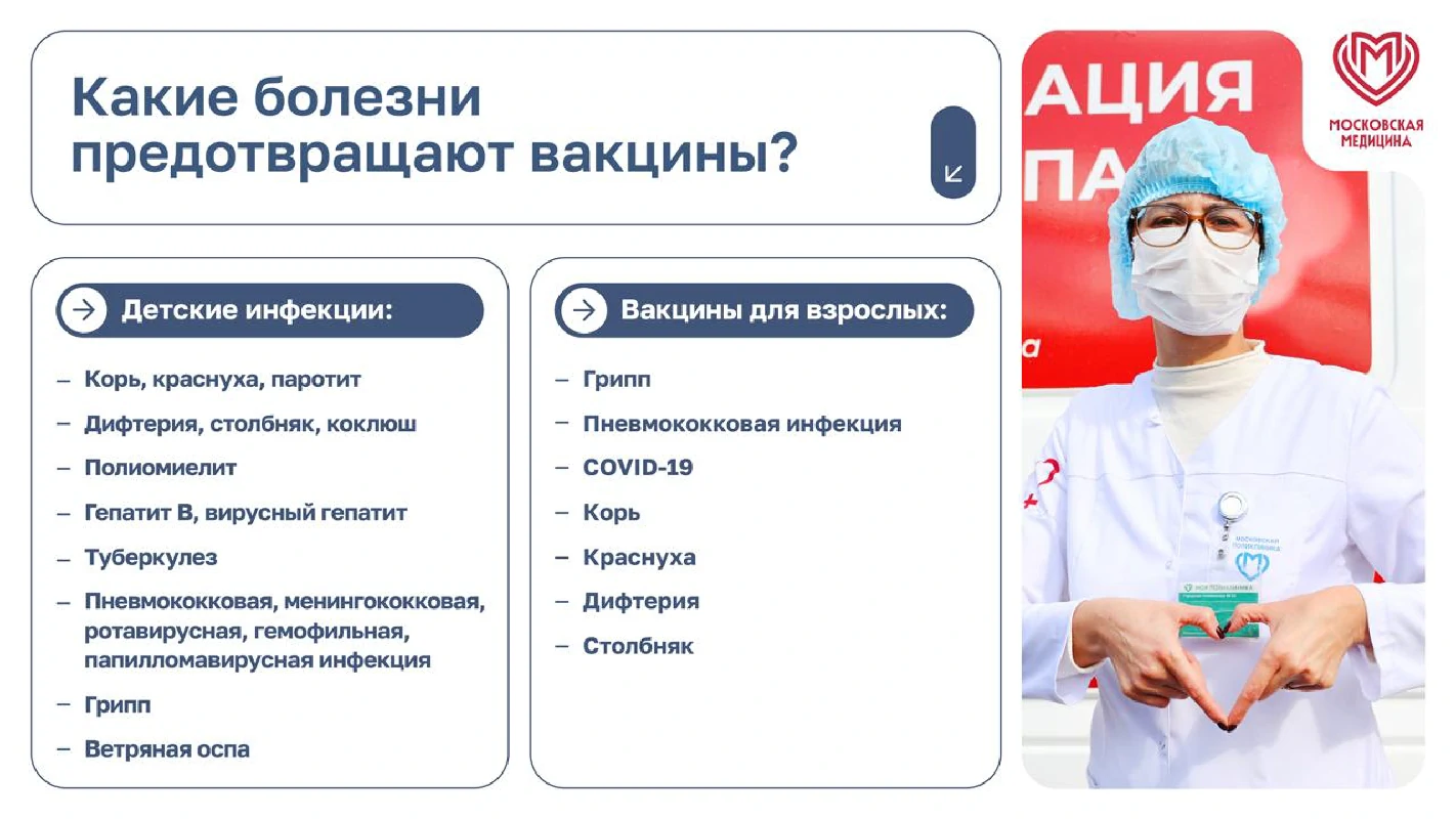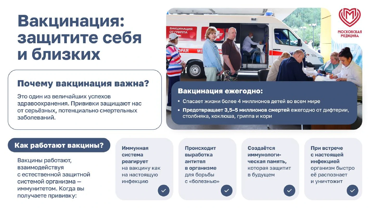 Вакцинация – простой, безопасный и эффективный способ защиты от болезней до того, как человек вступит в контакт с их возбудителями. Вакцинация задействует естественные защитные механизмы организма для формирования устойчивости к ряду инфекционных заболеваний и делает вашу иммунную систему сильнее.
